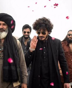 A group of rugged, stylish men walking together in a powerful slow-motion entrance. The main man in front has curly hair, a trimmed beard, wearing black traditional kurta with a long black coat, sunglasses, and hand raised in a respectful gesture. Rose petals falling from the sky. Behind him, tough-looking men with sunglasses and traditional clothing walk confidently. One elderly man with a big black turban and long grey beard stands on the left. Dusty outdoor setting with soft overcast light. Cinematic focus, shallow depth of field, dramatic atmosphere, ultra-realistic, 8K detailing, gritty film look, expressive emotions, stylized action-movie vibe