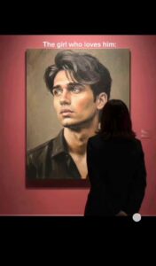 Create a scene in a contemporary art gallery using the attached image of the girl’s face and appearance, without altering her features. A large oil portrait of the girl hangs on the wall. Her face and upper body are painted in a realistic yet expressive oil-painting style with textured brushstrokes and muted colors. The red wall of the gallery creates a professional exhibition atmosphere, softly illuminated by warm lighting that highlights the artwork. In front of the painting, on the right side, a man stands with his back to the viewer, observing the portrait — adding a cinematic and mysterious mood to the scene.